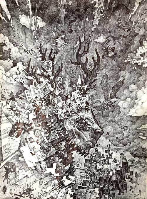 在圆珠笔绘制的纸笔空间中寻求无法改变一次成型的过程中,寻找空间与想法上的多层次多次元空间共存与展示,在二维与三维之间寻找平衡点,在线条的空间描写中寻找卡通与写实的共存,建立光影与平面的层次融合。