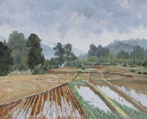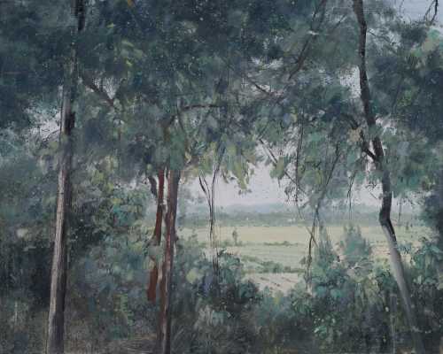 此作品是油画风景创作。在处理边缘线时试图在平面化与丰富性之间找到平衡点。表现对象是传统的自然风景,希望通过油画风景表达对音乐的感受:用指挥一场演奏般的笔触处理近处的草丛,用低音与高音般的反差来表达色彩的边缘,用架构和谐旋律的音程来丈量远近虚实,用繁而不乱的圆点编排大珠小珠落玉盘。