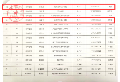 本届大赛邀请了来自上海音乐学院、四川音乐学院、广西艺术学院等区内外20余位知名专家担任评委。经过激烈的角逐,我校哲学专业的朱永之和艺术教育专业的梅紫怡取得了非专业组二等奖,这也是我校学生第一次在此项比赛中取得的最佳成绩。