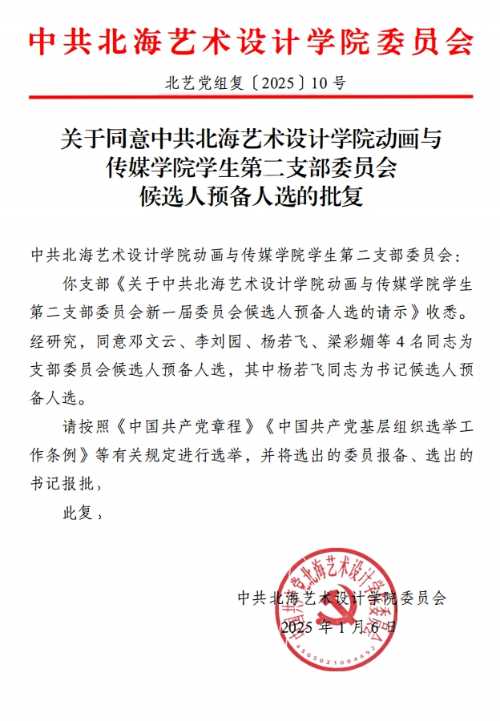 关于同意中共北海艺术设计学院动画与传媒学院学生第二支部委员会候选人预备人选的批复