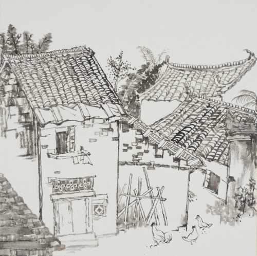 周彬彬,绘画专业,《树影鼓寨》,50x50cm,中国画
