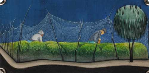谢瑞,《窗口》《围茶》,30x15x2,蜡笔、水彩