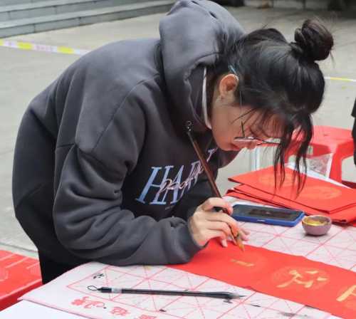 本次活动是由招募的志愿者人员进行现场书写春联,在寒风凛冽中每位志愿者紧握手中灼热的笔杆书写出对美好未来的憧憬与期盼。志愿者一起挥毫泼墨,用或丰实厚重,或飘逸潇洒的笔触,满怀热情地写下一幅幅饱含美好祝福的春联。正所谓无联不成春,有联春更浓,他们挥毫笔墨、走笔游龙,笔尖点缀着人间烟火气息,赢得在场学生阵阵赞誉。“爆竹四起接五福,梅花一枝报三春”、“福如旭日腾云起,财似春潮乘风来”、“国泰民安逢盛世,风调雨顺颂华年”一幅幅春联里都承载着新春最诚挚的祝福。