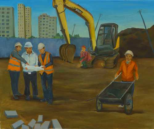 杨嘉丽《工地的午餐》52cm×74cm 2023年 纸本水彩