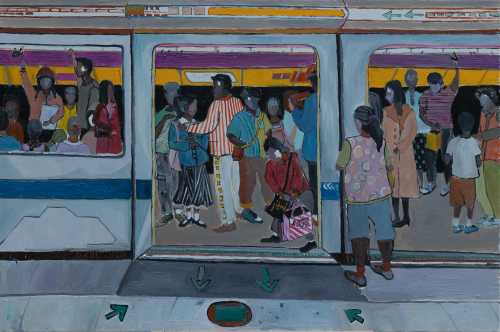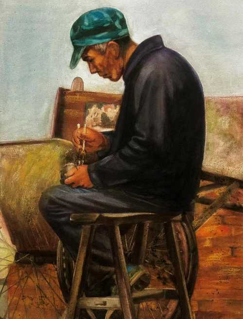 杨圆缘《进城的农民工》 52cm×52cm 2023年 纸本水彩