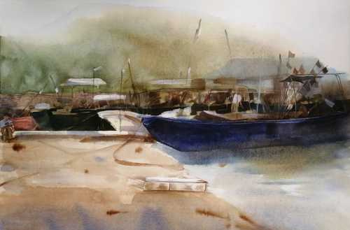 龙以涛《静静的港湾》50cm×70cm 2023年 纸本水彩