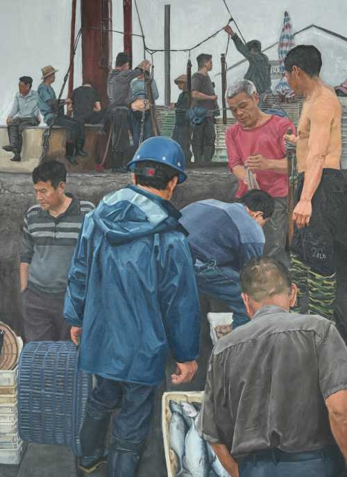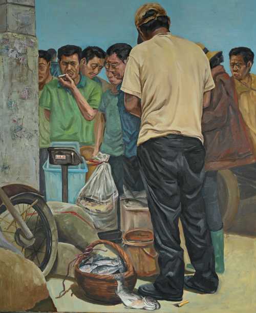 二等奖 绘画2105班 易宁波 《侨港早市》 150cm×110cm 指导教师:袁志伟