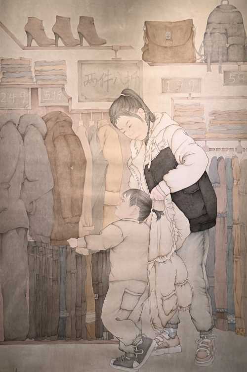 绘画2102班 梁君 《服装店母女》 115×165cm 指导教师:陈建江