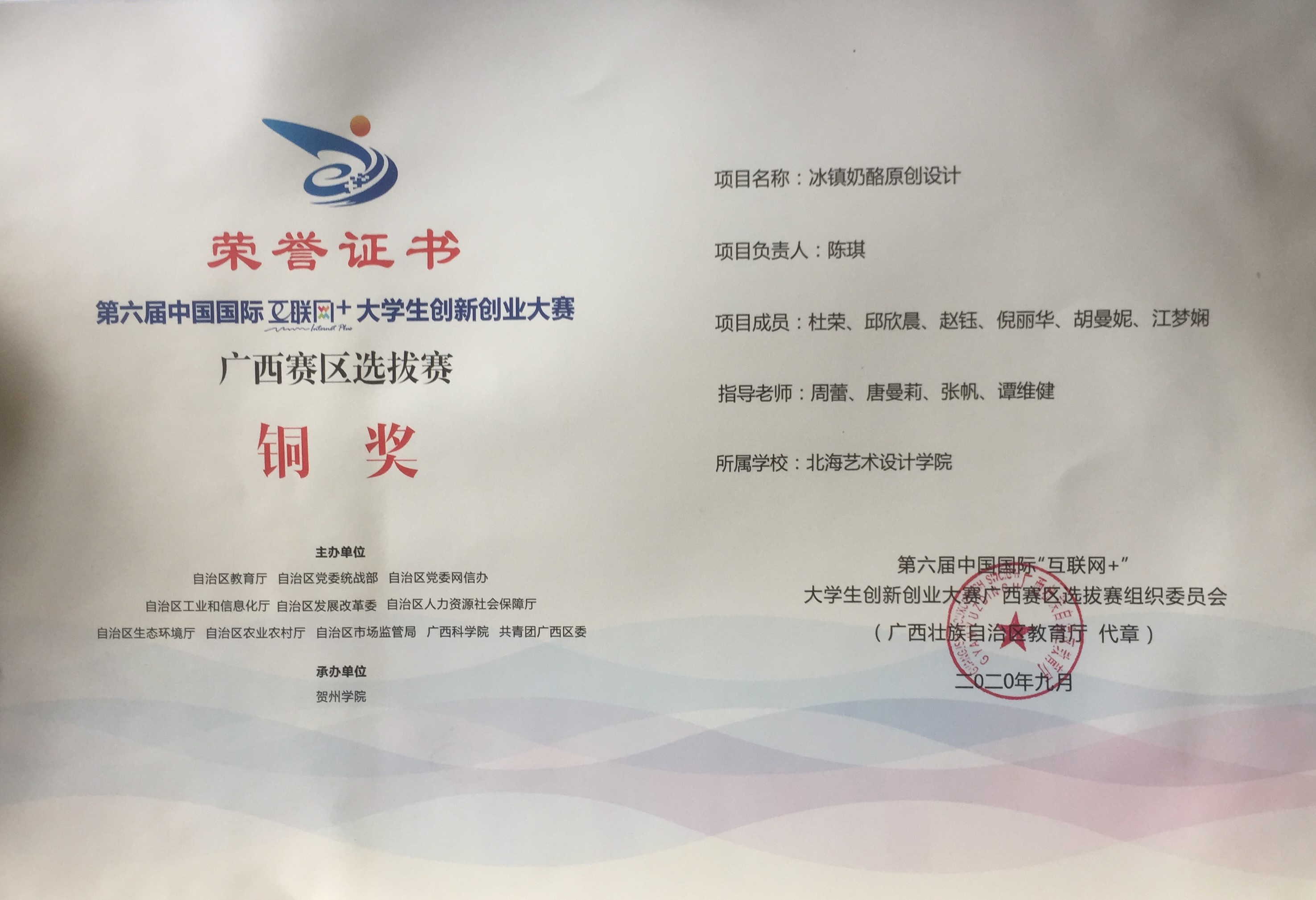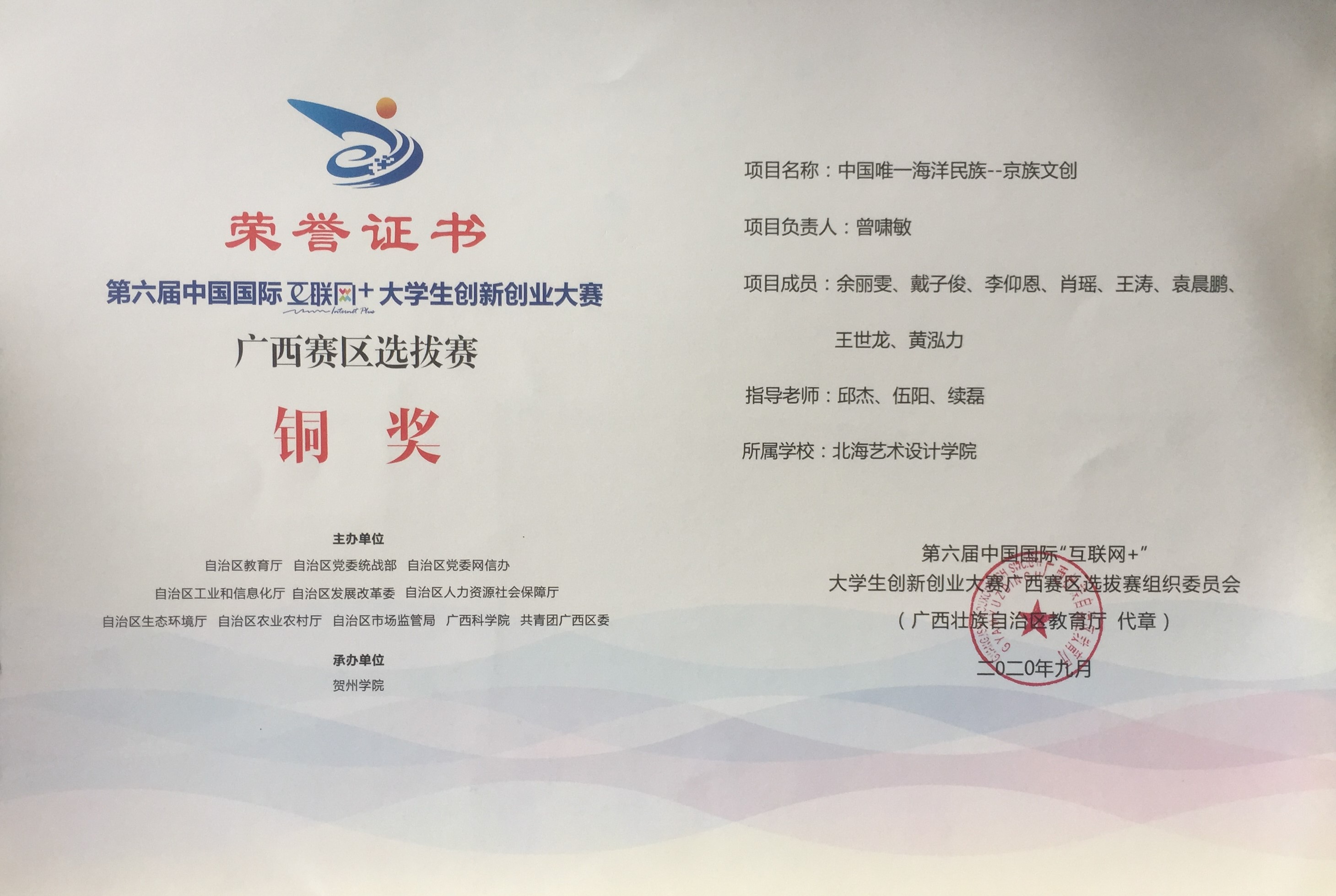 北海艺术设计学院第六届中国国际“互联网+”大学生创新创业大赛广西赛区获奖证书