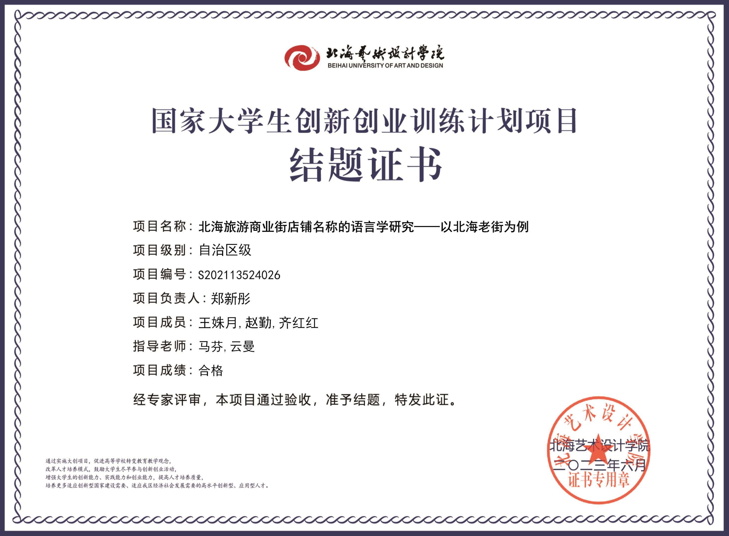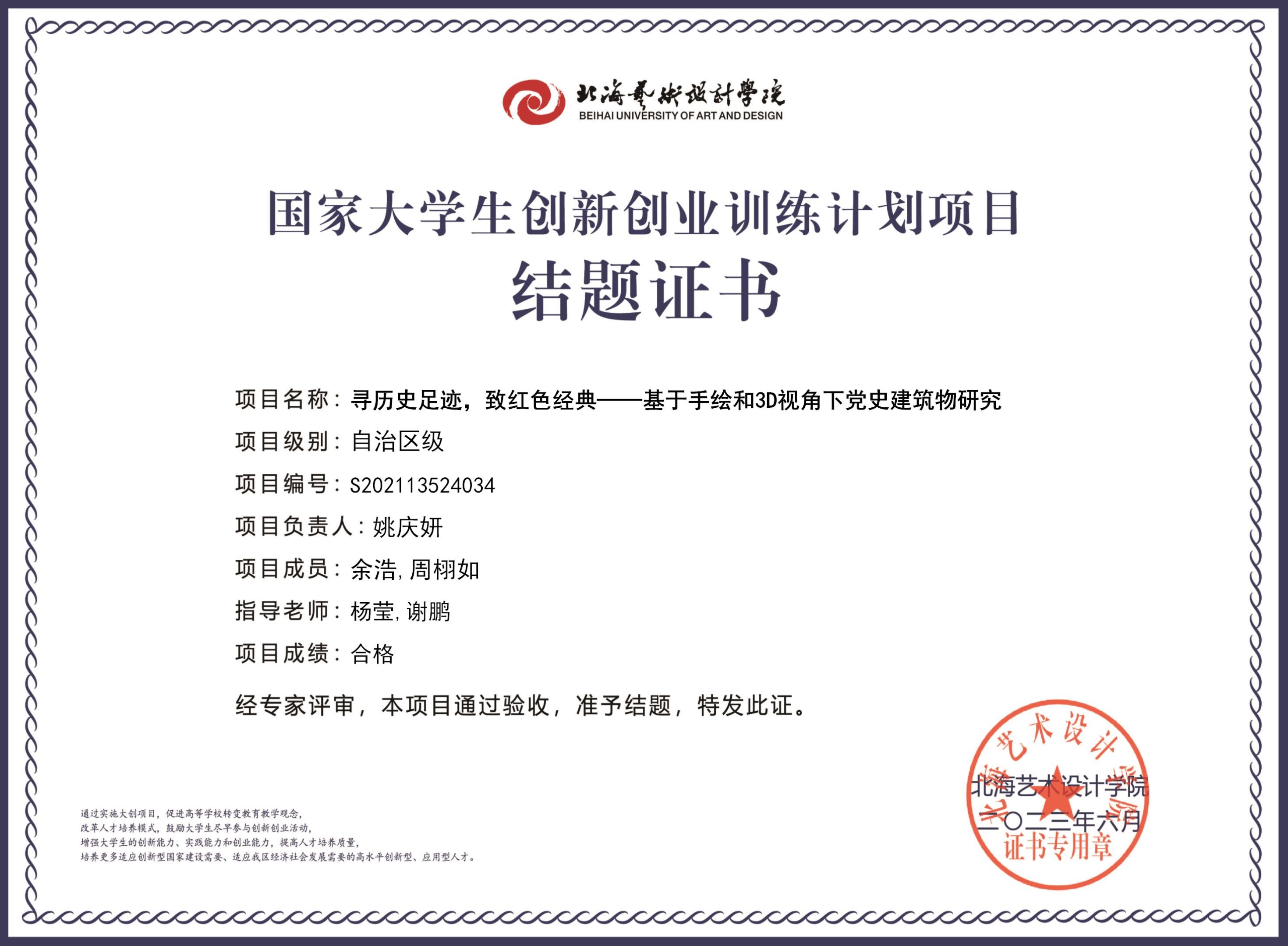 2023年大创项目结题证书(2021立项)