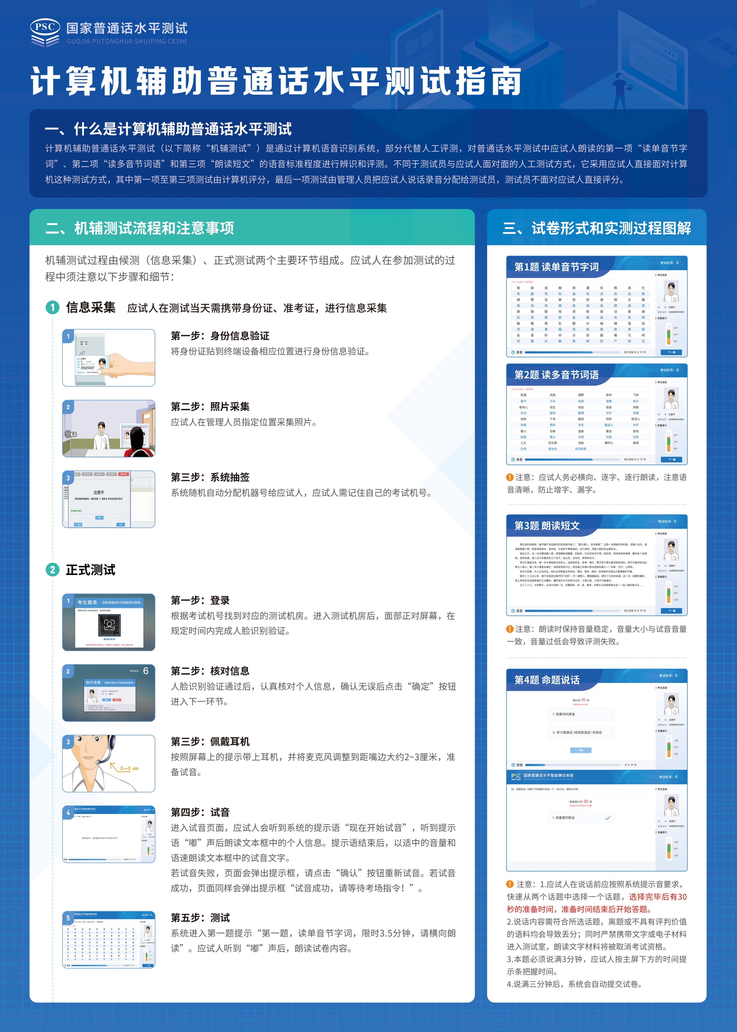 (五)根据《普通话水平测试管理规定》(教育部令第51号)和《普通话水平测试规程》(国语函〔2023〕1号)等相关文件规定,自2023年4月1日起,普通话水平测试将使用人脸识别防作弊系统进行现场信息采集和抽签,取消备测室和备测时间等备测环节,测试试卷由系统随机分配。具体考试流程和注意事项详见附件2和附件3。