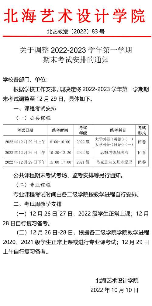 关于调整2022-2023学年第一学期期末考试安排的通知