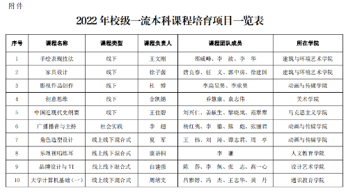 根据《关于组织开展 2022 年校级一流本科课程培育项目申报工作的通知》(北艺教务〔2022〕106 号)要求,教务处认真组织开展了2022 年校级一流本科课程培育项目申报、立项工作。经各二级学院遴选推荐、教务处资格审核及校内外专家评审,拟认定《手绘表现技法》等 10 门课程为校级一流本科课程培育项目。现将认定结果予以公示,具体名单见附件。公示期自 2023 年 3 月 6 日至 3 月 10 日,共 5 工作日。公示期内,如对认定结果有异议,请以书面形式或电话形式向教务处反映,逾期不再受理。书面形式须署真实姓名交至教务处行政楼 324 办公室,联系电话:138-7792-9312。