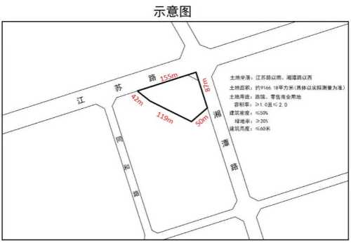 考察地点位于江苏路以南、湘潭路以西的约9166.18平方米土地,被规划为旅馆与零售商业用地,需满足容积率在1.0至2.0之间、建筑密度小于50%、绿地率超过20%以及建筑高度不超过60米的条件,旨在打造集住宿与购物功能于一体的综合性商业区域。