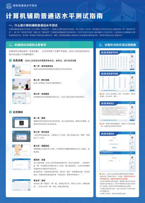 (四)根据《普通话水平测试管理规定》(教育部令第51号)和《普通话水平测试规程》(国语函〔2023〕1号)等相关文件规定,自2023年4月1日起,普通话水平测试将使用人脸识别防作弊系统进行现场信息采集和抽签,取消备测室和备测时间等备测环节,测试试卷由系统随机分配。具体考试流程和注意事项详见附件2和附件3。