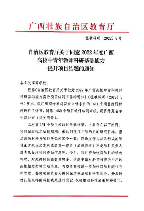 桂教科研〔2022〕8号自治区教育厅关于同意2022年度广西高校中青年教师科研基础能力提升项目结题的通知.rar
