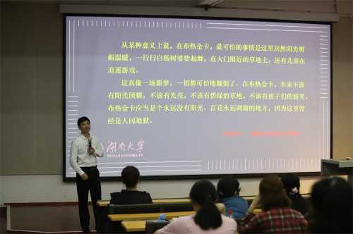 讲座过程中,谭教授与在场师生进行广泛互动,授课氛围活跃,深入浅出的讲授令广大师生受益匪浅。最后他指出要培养能听得懂“机器人”语言的自由诗人,训练能读得下“旧经典”语言的专业新人,塑造能写得出“新思想”语言的创造高人。他赠与在场师生三句警句:“向内生长,向外飞扬。诗人想象,自由思想。经典阅读,创造表达”,对大家寄予了深切期望。