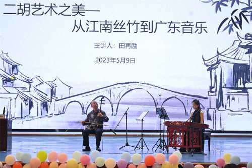 随着一曲耳熟能详的《步步高》响起,田教授现场展示了广东音乐的主奏乐器——高胡的艺术魅力。紧接着,江南丝竹八大代表作之一——《行街》细腻婉转的音响又飘进每位在场观众耳中。田教授结合现场演奏,详细讲解了广东音乐和江南丝竹的演奏形式、代表人物与代表作品。讲座妙趣横生、气氛热烈,受到了师生们的高度欢迎,加深了师生对江南丝竹、广东音乐等中国传统民族器乐音乐的认识,点燃了师生对二胡、高胡艺术的浓厚兴趣。