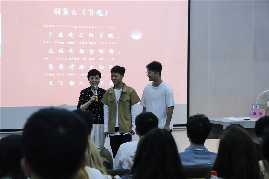 在讲座最后,周游教授再次请同学们上台朗诵诗歌,通过同学们的朗诵,他表示同学们应该对诗歌有属于自己了解,多诵读诗歌,营造诗歌的情感和画面感,将情感炼入诗歌中,最终呈现出满富情感的诗歌,希望同学们都能感受朗诵的魅力。