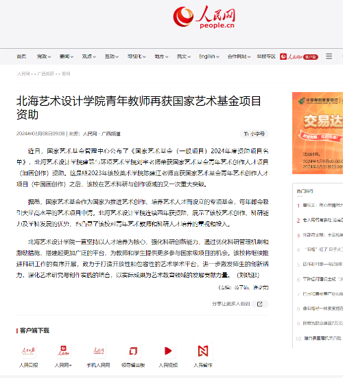 人民网:北海艺术设计学院青年教师再获国家艺术基金项目资助