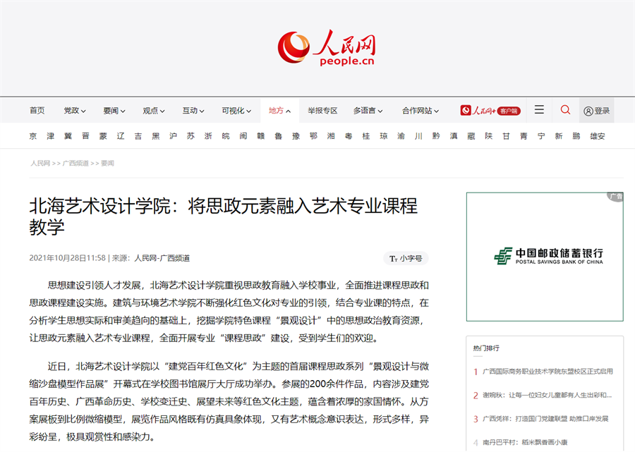 10月28日,人民网以《北海艺术设计学院:将思政元素融入艺术专业课程教学》为题,报道了我校将思政教育融入专业课程教学的探索成果。以“建党百年红色文化”为主题的首届课程思政系列“景观设计与微缩沙盘模型作品展”,作品风格围绕红色文化展开,形式多样,思政元素自然融入艺术专业课程,贯穿始终又不破坏艺术个性的自由创造,深受学生们的欢迎。各个学院认真总结展示“课程思政”成果,学校思政改革氛围日益浓郁。