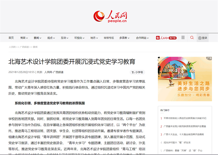2021年12月28日,人民网以《北海艺术设计学院团委开展沉浸式党史学习教育》为题,关注报道了我校团委多维度营造党史学习教育浓厚氛围,带动广大青年深入感受红色力量,组织开展沉浸式党史学习教育。