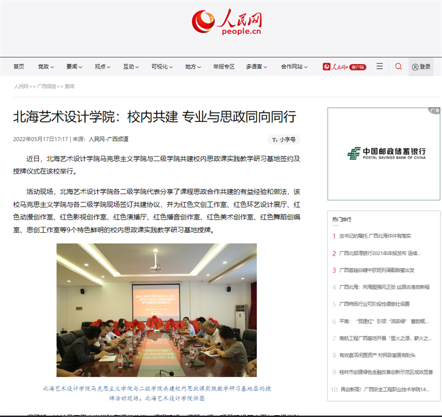 5月17日,人民网以《北海艺术设计学院:校内共建 专业与思政同向同行》为题,关注报道我校马克思主义学院与各二级学院合作共建校内思政课实践教学研习基地,挖掘专业课程中的思政元素并融入课堂教学,促进专业与思政同向同行。