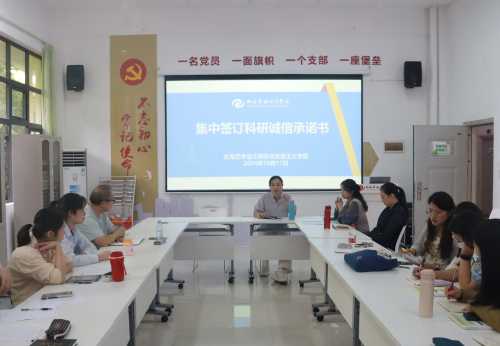 首先,我院副院长罗秋梅认真传达了《关于开展科研诚信建设学习教育宣传月活动的通知》精神;其次,全院教师现场集中签订了科研诚信承诺书;最后,她还针对全体教师科研成果的校内备案工作进行了强调。