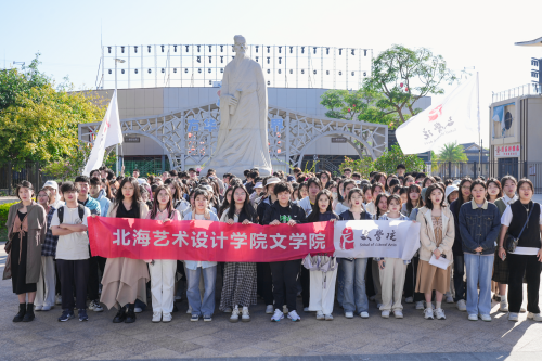 为收集本次实践调研需要撰写调研报告的一手材料,学生们在带队老师的组织下有序分批地进入场馆。学生们参观了馆内各种雕刻艺术品,充分领略了北海角雕、贝雕、木雕与现代审美、现代装裱工艺相结合的艺术之美,并且对雕刻作品题材的丰富性、形式的多样性赞不绝口。此外,学生们还领略了小江瓷、赤江陶、南流江玉等其他作品的艺术魅力。