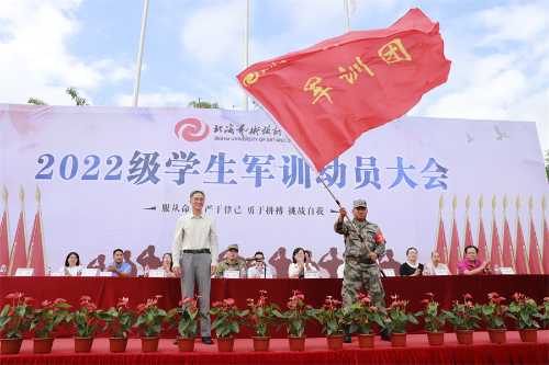 最后,我校校长卢新华向军训总教官授军训团旗并宣布2022级学生军训开训。