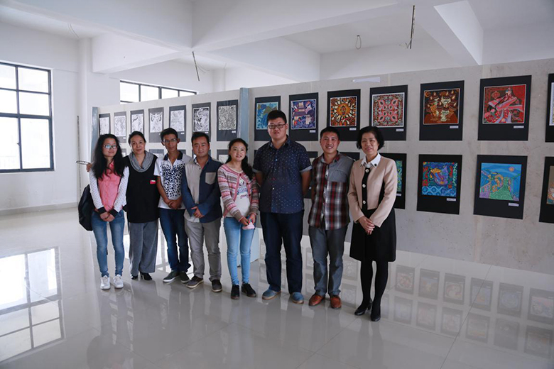 在参观中,张建虹、张跃两位副院长认真听取了本门课程主课教师云曼老师对课程的介绍。李佩、黄锦、张志等任课教师也对本班的学生作品从构思到最后成品装裱做了介绍。