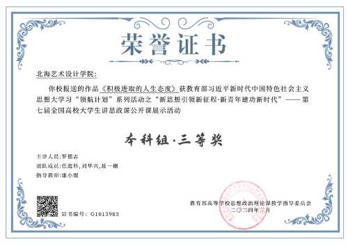 2023年,我校选送作品参加了教育部高校思想政治理论课教学指导委员会、广西壮族自治区教育厅先后举办的习近平新时代中国特色社会主义思想大学习领航计划系列主题教育活动,我校作品在活动中脱颖而出,荣获多项佳绩。其中,大学生讲思政课作品《积极进取的人生态度》荣获“新思想引领新征程·新青年建功新时代”第七届全国高校大学生讲思政课公开课展示活动本科组三等奖;大学生微电影作品《回响》《如愿》《退伍不褪色》荣获“我心中的思政课”2023年全区高校大学生微电影展示活动本科组三等奖。