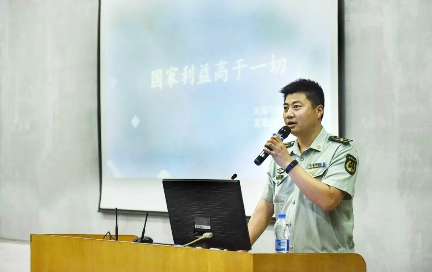 2016年4月20日晚上19:20分,我校邀请了北海市龙潭边防派出所的警官为我校师生开展了"校园安全知识讲座"。本次讲座首先通过李教导员"国家利益高于一切"展开话题,通过视频资料以及亲身经历,讲述了一个又一个无私奉献的故事,身为中国武警,应秉承国家、人民的利益高于一切的高尚品格,与忠诚意识融为一体,这是一种责任,是一种行动,李教导员为我们展示了当代军人迷人的风采,让在座同学们深深体会到那群“可爱的人”为了国家安全,人民安全所做的重要贡献,令同学们深感钦佩。