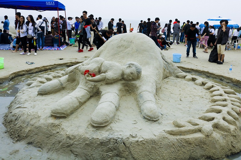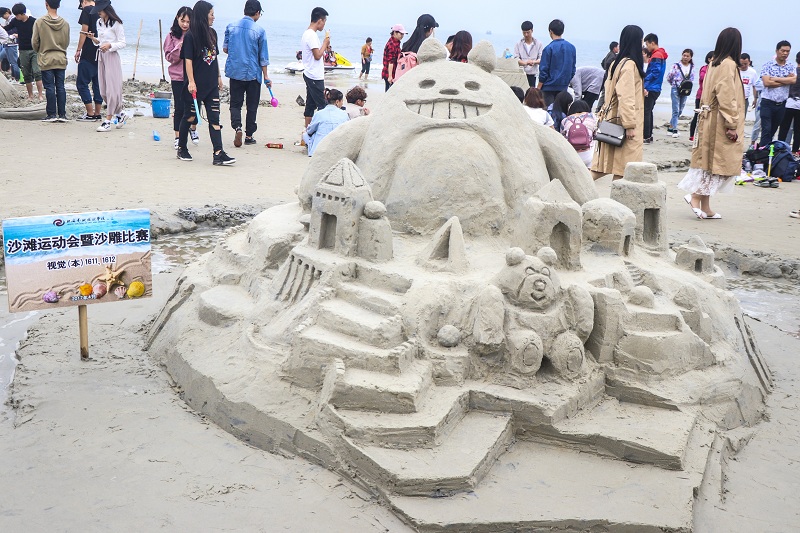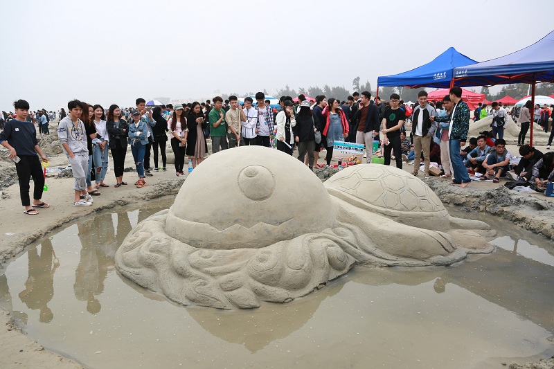同时13届沙雕比赛也如火如荼的进行着。沙雕大赛是我院传统活动之一,参赛的师生展开自己丰富的想象力,将创意融入沙雕,现场有雕塑乌龟、企鹅、汽车等不同作品。沙雕大赛已成为北海银滩景区一道亮丽风景线,引来很多游客驻足拍照。