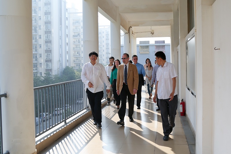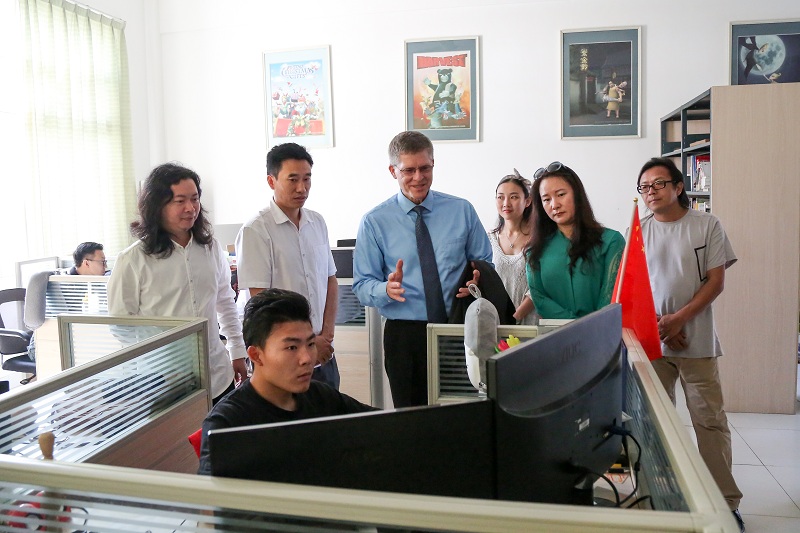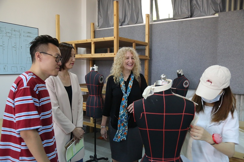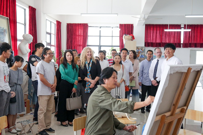 随后,在郑超副院长和各级领导的陪同下,Philip Reubin Johnso校长一行参观了我院校园环境及教学实训室。在动画学院工作室、服装工作室和油画研修室,除了观赏学生作品,同行的Denise Lynn Vandeville教授和Richard Lynn Gee教授还与学生进行交谈,了解专业情况。