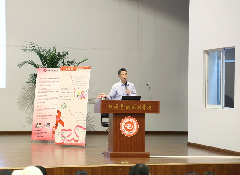 随后由北海市民间志愿者协会吕良勇博士进行预防艾滋病公益知识讲座。吕教授为我们详细介绍了艾滋病以及如何预防艾滋病。他指出艾滋病传播方式主要是血液,不良性行为,母婴和吸毒,并为我们播放了患艾滋病症状的图片,例举了一些艾滋病的案例,让学生们详细了解艾滋病感染、传播、预防等知识,号召大家关爱艾滋病患者。