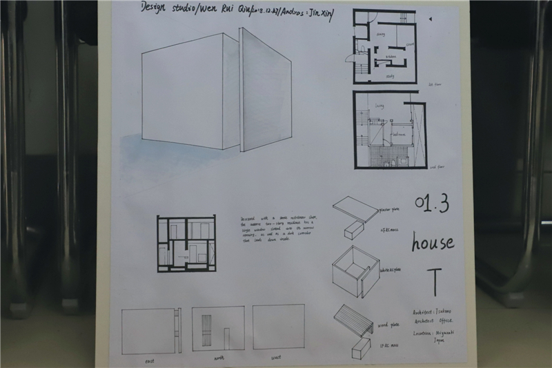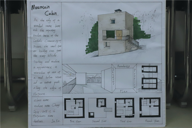 国际班的罗慧婷同学率先进行作品《HOLIDAY HOUSE》的展示汇报。接下来温瑞秋、常奇明、霍晋东、仲彤、琚司蒙、曾宏六位同学也依次携作品《VACATION》、《Building Eyes》、《HOLIDAY HOUSE》、《HOLIDAY HOUSE》、《Holiday House》、《An Interesting Buiing》进行了各自的展示汇报。让官微君印象深刻的是常奇名同学的作品,他在介绍自己的建筑设计方案时提到:“因为屋顶与地面平行,我的建筑是和整个森林、整个世界融为一体的,而不是那么突出显眼。我的建筑三个面都是玻璃,有着更宏大的视野,给人一种更贴近自然的感觉。”生动展现了他设计中的自然和谐气息概念。