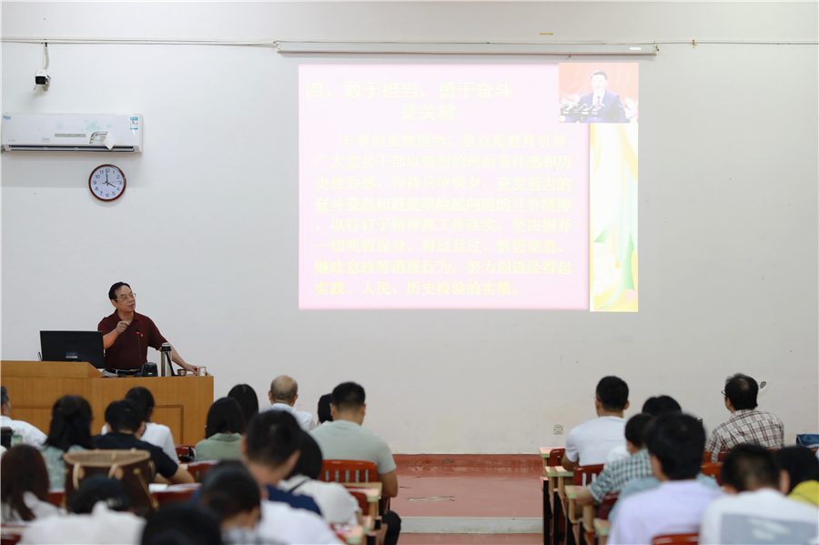 我校哲学教授蒙绍荣作了“不忘初心要忠诚,牢记使命有担当”的主题报告。蒙教授强调,开展此次主题教育是以习近平新时代中国特色社会主义思想武装全党的迫切需要,是推进新时代党的建设的迫切需要,是保持党同人民群众血肉联系的迫切需要,是实现党的十九大确定目标任务的迫切需要。蒙教授结合丰富的事例、深入浅出地阐释了教师“不忘初心、牢记使命”责任内涵,勉励大家要种好自己的责任田,忠诚于党和国家的教育事业,在工作岗位上勤勉努力有担当有作为。