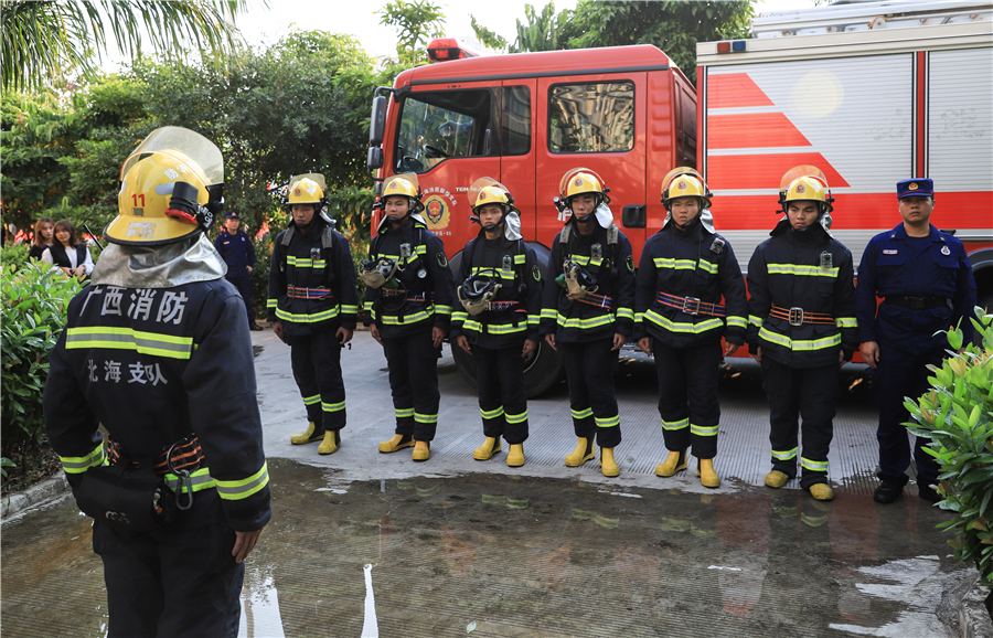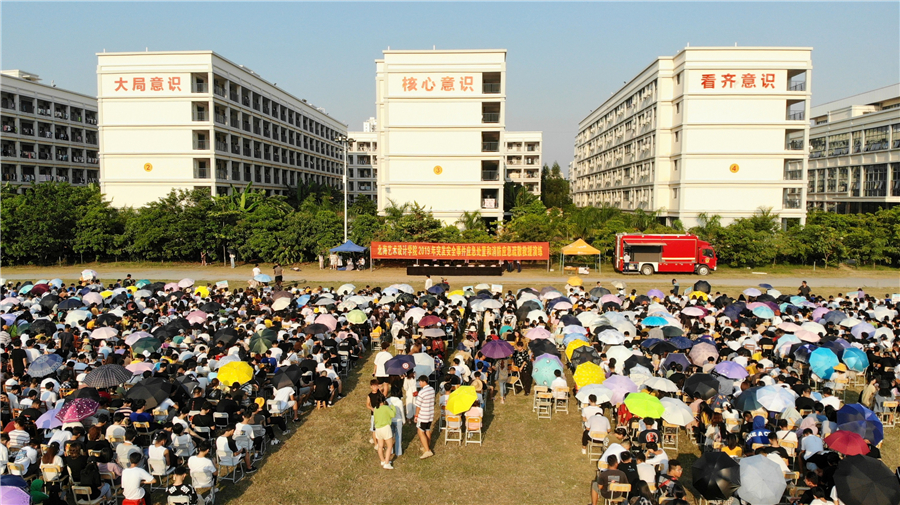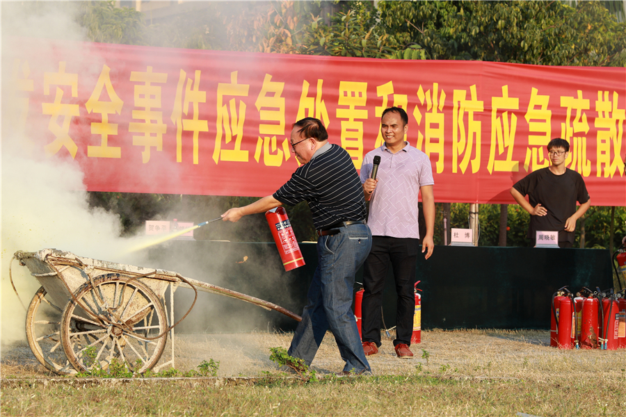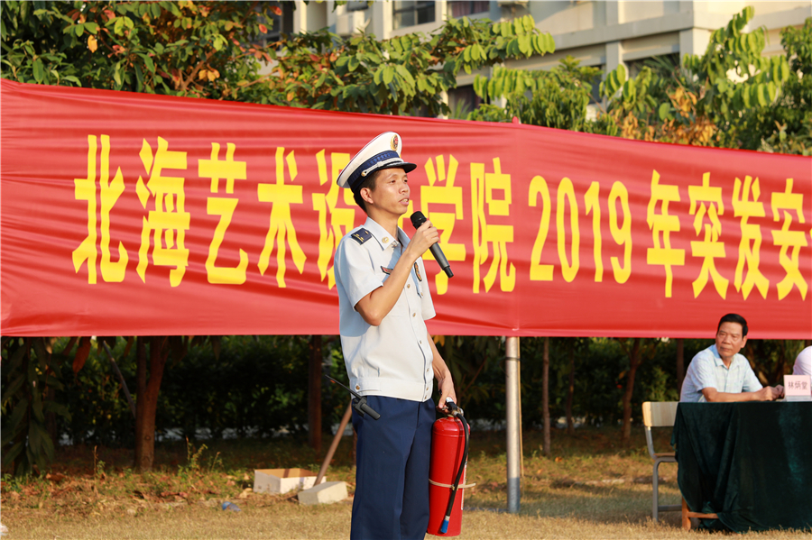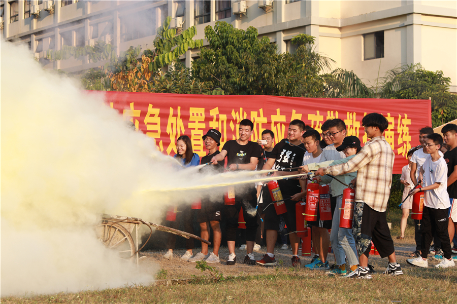 此次演练包括校园安全冲突、模拟火情、应急疏散逃生、现场救护、自救互救、灭火器的使用等六个部分。参加此次演练的单位和人员有北海市银海区消防大队电建渔港中队,学校各职能部门、各二级学院领导老师,以及2019级全体新生、学生干部和宿舍长等参加。