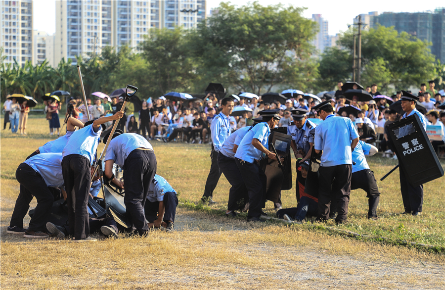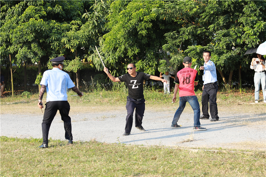 现场模拟不法分子持有管制刀具强行闯入校园,巡逻队员发现后立即拨打校园110,应急处置组立即启动应急预案,集结优势警力并携带防卫器械赶往现场,与不法分子进行周旋,最终,在全体保安队员的共同努力下把所有不法分子制服。学校医务人员及时赶到现场救治受伤人员,就地取材,利用简易器械进行止血包扎,对于心脏呼吸停止的伤员,就地实施心脏复苏急救。