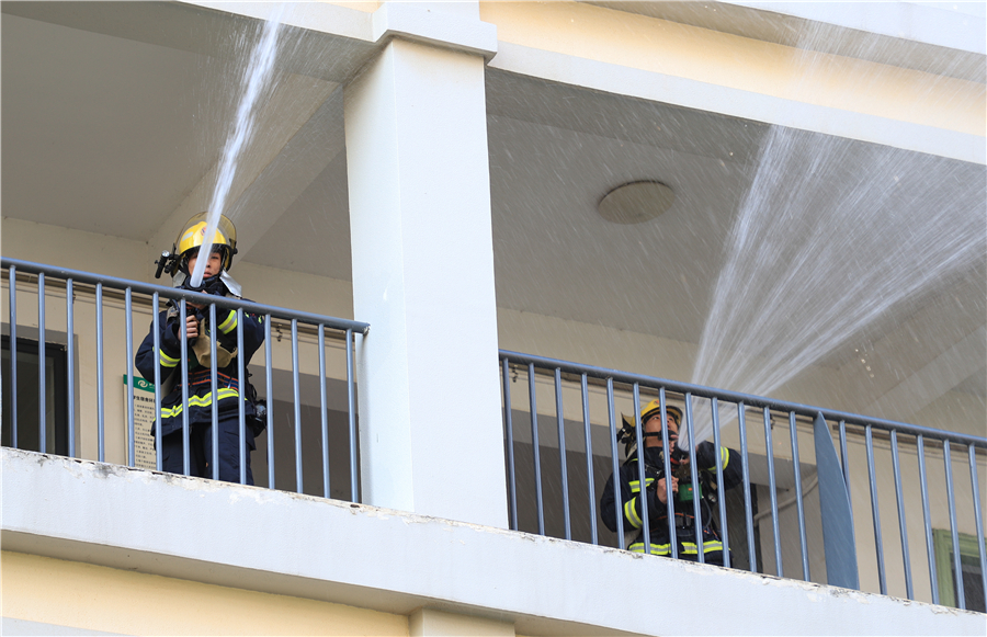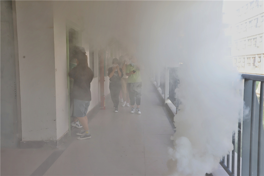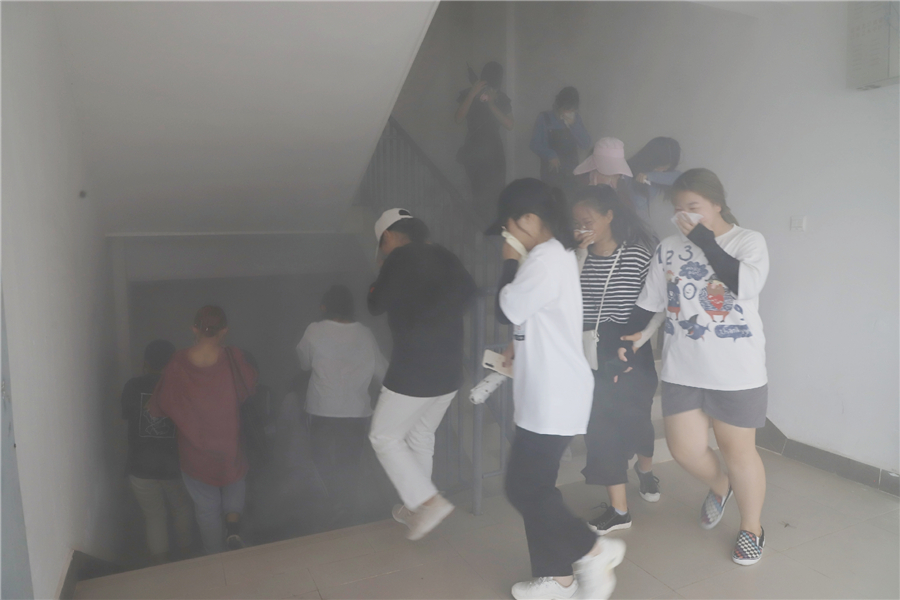 随着指挥员一声令响,我校西校区学生公寓2幢模拟燃放了烟雾弹,霎时烟雾弥漫,各班同学在宿舍管理员和安保人员的引导下不断从“失火”的楼道中奔出,同学们在疏散过程中都做好了防护措施,严格听从引导路线有序的靠右向楼下疏散,几分钟后全体参演的同学安全撤离火灾现场,整个疏散演练过程规范、有序、安全、顺畅,没有发生任何拥挤和踩踏的安全事故。