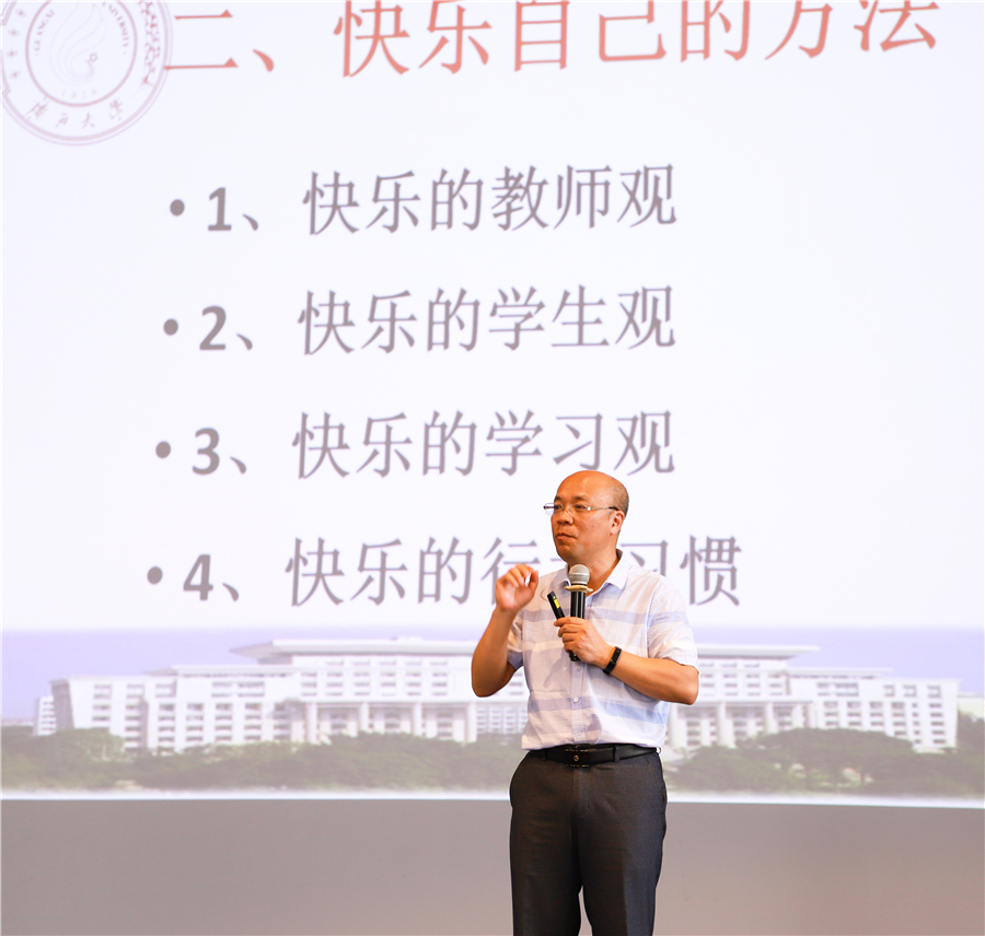 讲座中,谭贤政教授重点讲述了快乐自己的方法,就是要转变教师观、学生观、学习观和行为习惯。在讲述转变学习观时,谭教授指出,学生都是具有主体性、潜在性和个性差异的人,在学习过程中要积极寻找方法克服缺点,不断激发潜能,才能在学习和工作中获得更大的成功。