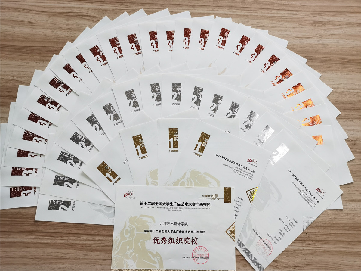 2020年12月15日,由广西壮族自治区教育厅、全国大学生广告艺术大赛广西赛区组委会举办的第十二届全国大学生广告艺术大赛(以下简称“大广赛”)广西赛区颁奖典礼在广西艺术学院南湖校区会演中心举行,我校荣获广西赛区一等奖4项,二等奖28项,三等奖38项的优异成绩,同时我校荣获“优秀组织奖”。