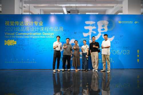 陈丹玲书记(左三)、伍岳总经理(左二)、徐雅斯总监(右三)与实验室副主任岳沛龙(左一)、宋超(右二)、教研室副主任石宏伟(右一)在 2020级品牌设计课程作品展主视觉展板前签字留影