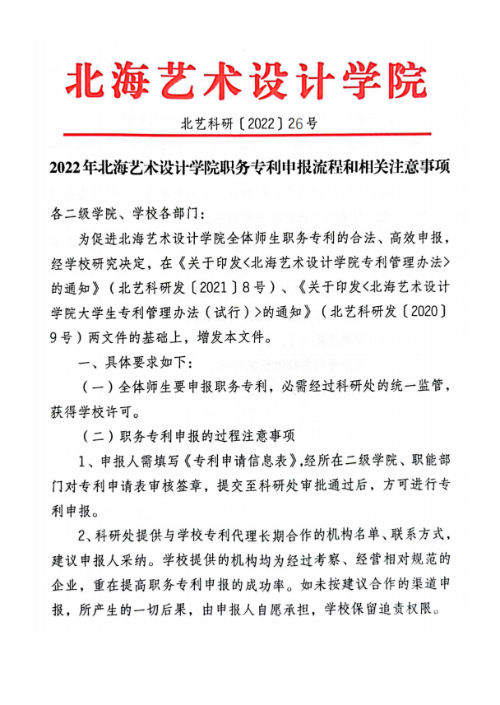 2022年北海艺术设计学院职务专利申报流程和相关事项