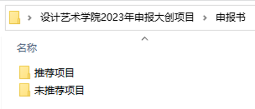 1.电子版:申报书(内含两个文件夹,分别以“推荐项目/未推荐项目”命名)、项目一览表。以上内容须置入1个文件夹内并压缩成1个Rar格式文件,文件夹命名:二级学院+2023年申报大创项目(例“设计艺术学院2023年申报大创项目”)。由各二级学院汇总后于2023年5月31日前发送至邮箱:bhyscxcy@163.com(不接收学生个人项目单独发到此邮箱)。二级学院文件夹压缩包层级如下: