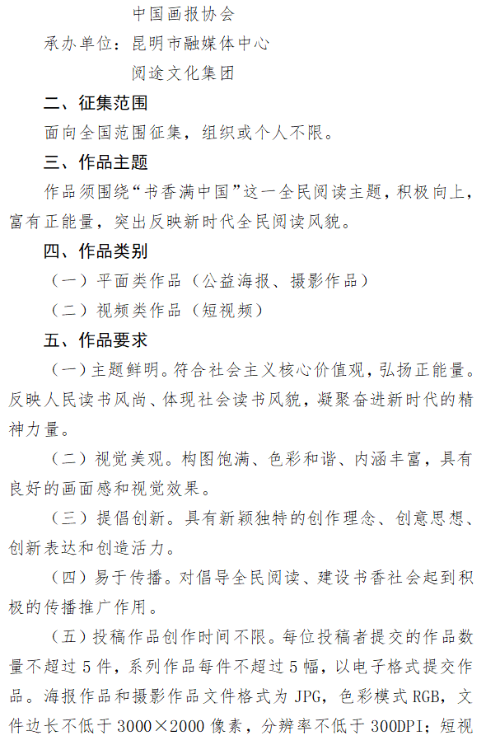 为展示优秀的全民阅读公益广告作品,传递读书力量,营造“爱读书、读好书、善读书”的良好氛围,提升公众对阅读价值的认知和理解,由中国出版协会、中国新闻文化促进会、中国画报协会联合主办的第三届全民阅读大会“书香满中国”公益广告展现面向全国公开征集作品,全民阅读主题优秀海报、摄影及视频作品等符合条件的作品将予入展。现将活动相关事宜通知如下: