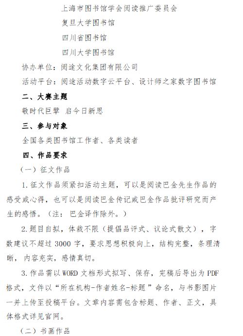 为推进文化自信自强,纪念巴金先生为当代文坛作出的杰出贡献,在巴金先生诞辰120周年之际,江苏省图书馆学会、上海市图书馆学会、四川省图书馆学会联合举办“品读巴金”阅读创作大赛,引导广大读者关注阅读、爱上阅读、传播阅读。