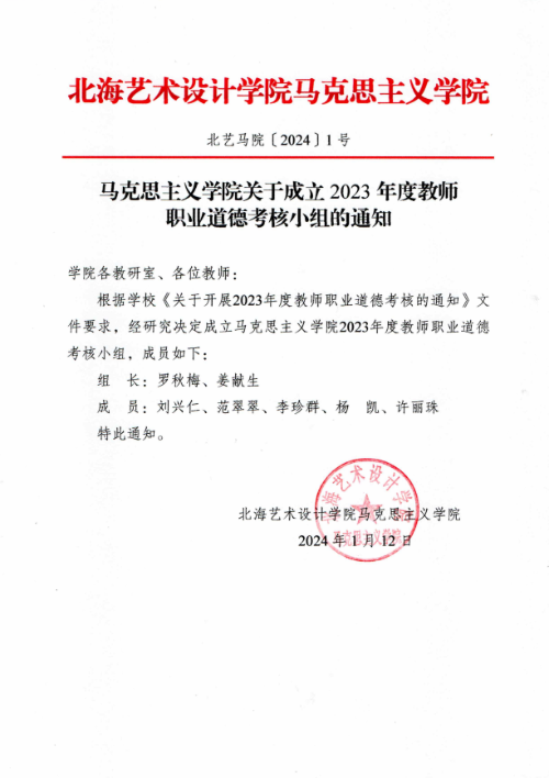 北艺马院〔2024〕1号 马克思主义学院关于成立2023年度教师职业道德考核小组的通知