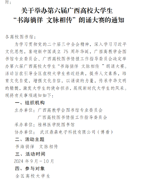 为学习贯彻党的二十届三中全会精神,深入学习习近平文化思想,喜迎新中国成立75周年华诞,广西高教学会图书馆专业委员会、广西高校图书情报工作指导委员会决定举办第六届广西高校大学生“书海徜徉 文脉相传 ”朗诵大赛。活动旨在引导全区在校大学生亲近经典,提升人文素养,培育文化自觉,增强文化自信,以诵读的力量,传承中华文明的精髓,激发大学生的使命担当,展现新时代大学生的风采。现将有关事项通知如下: